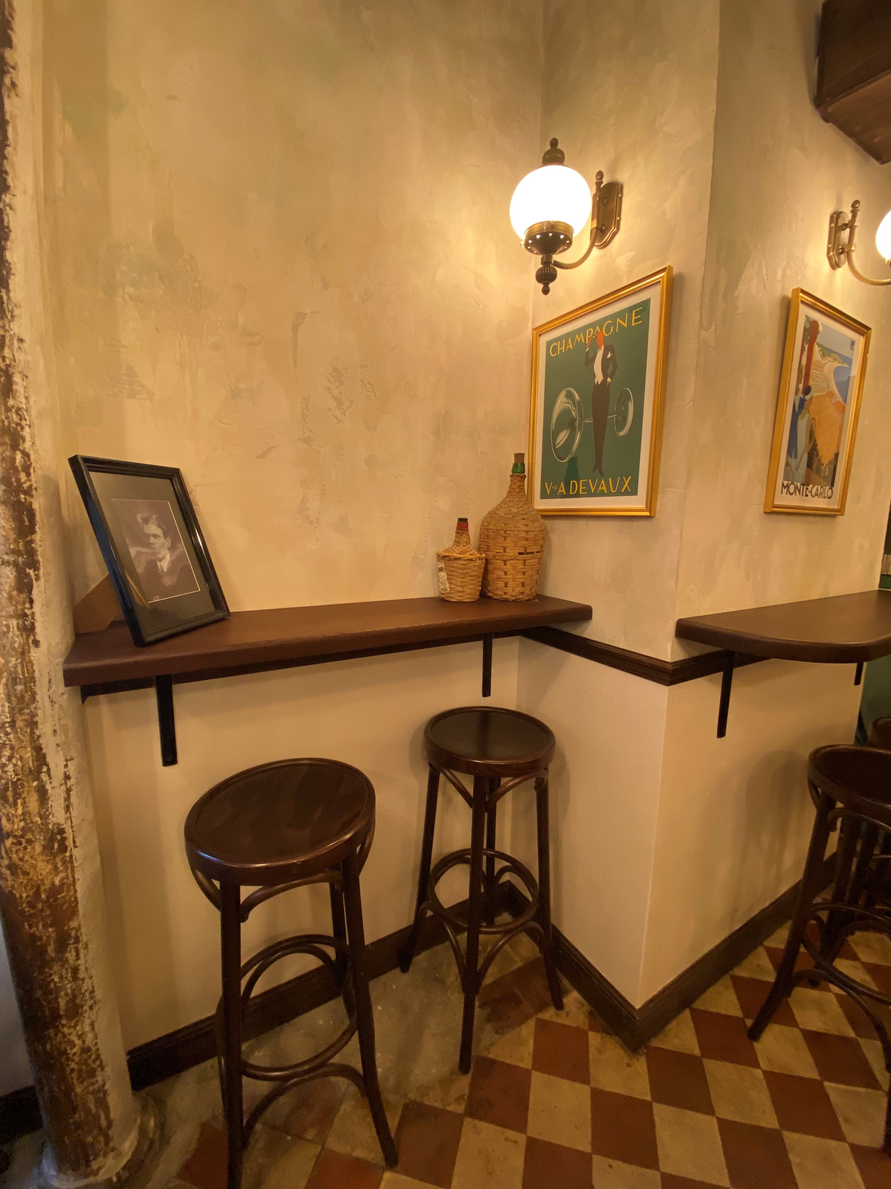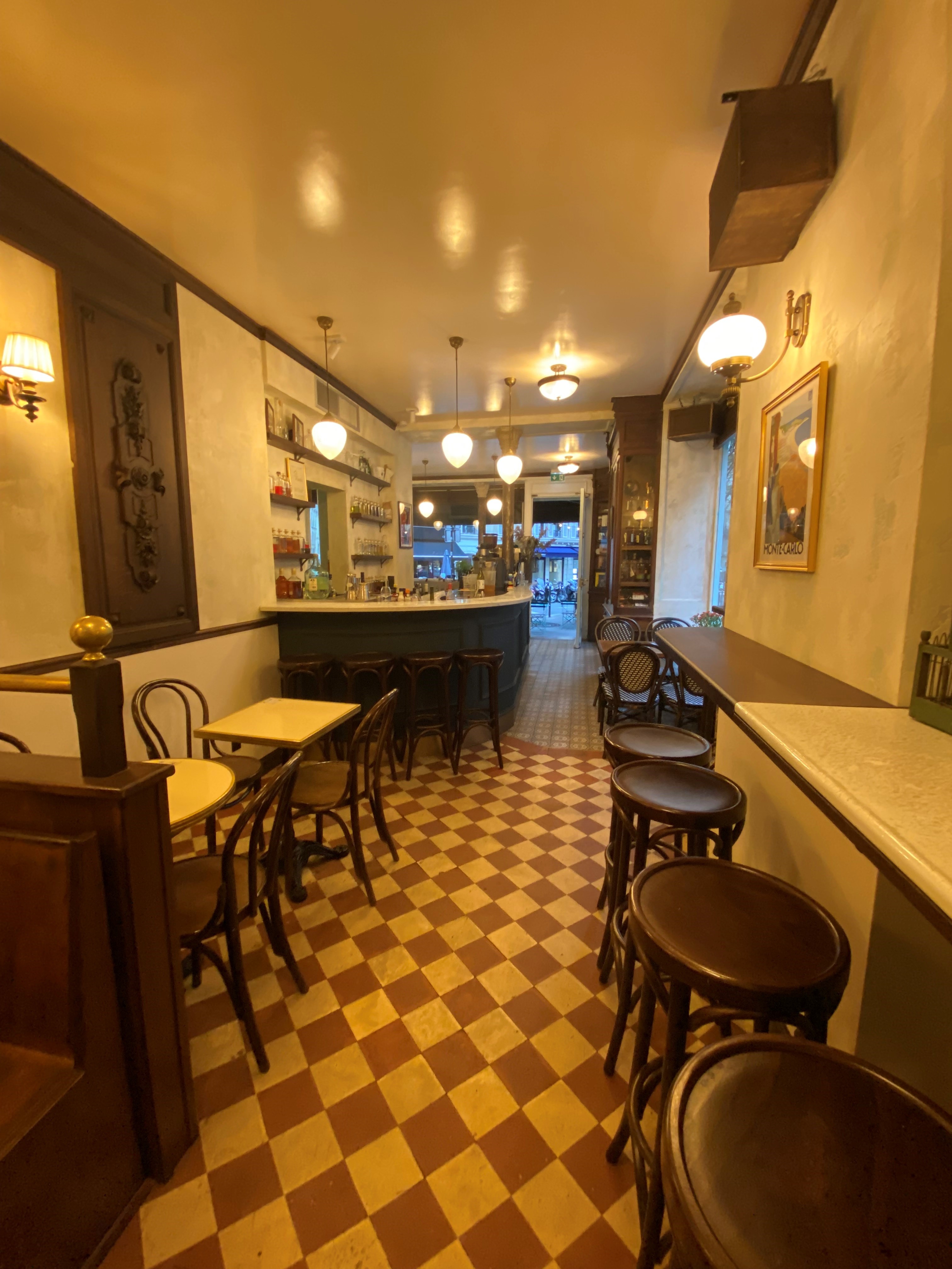 Inside, you’ll find a retro ambiance with period tiles, cut glass light fixtures, and dark wood cabinets and outside, a large terrasse for the warmer days.