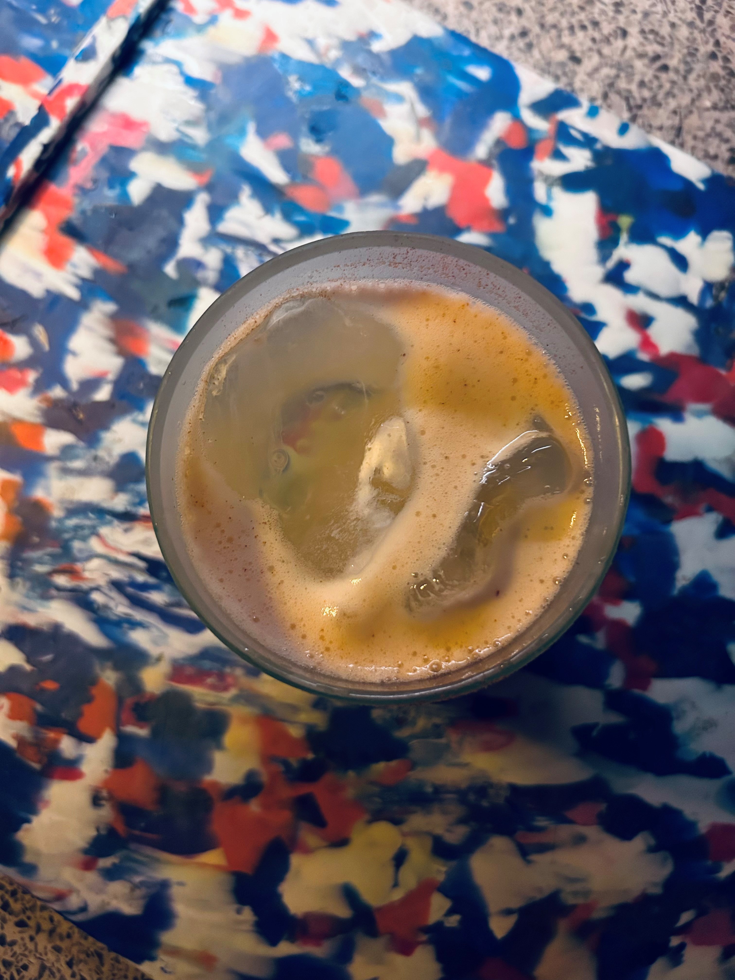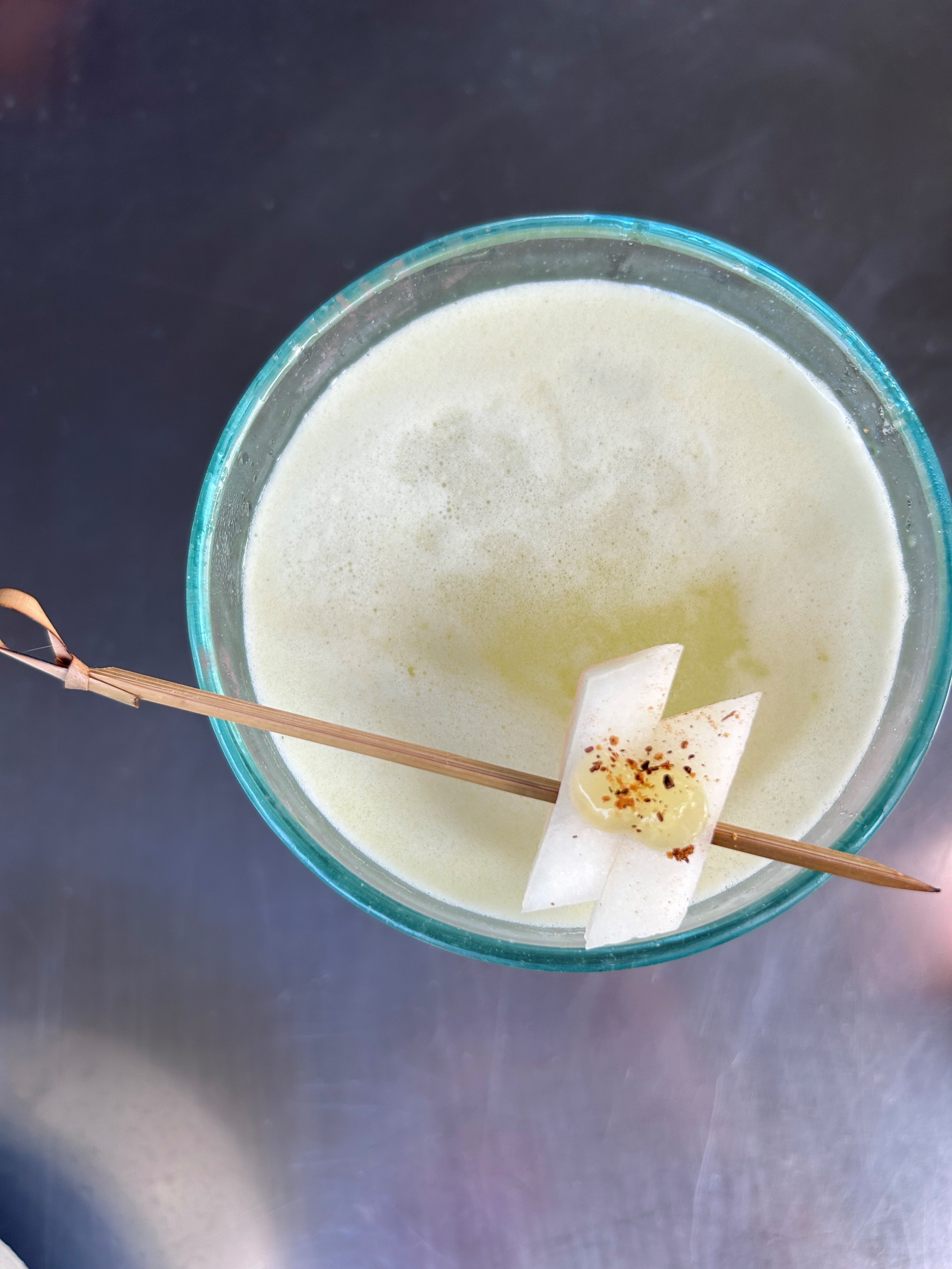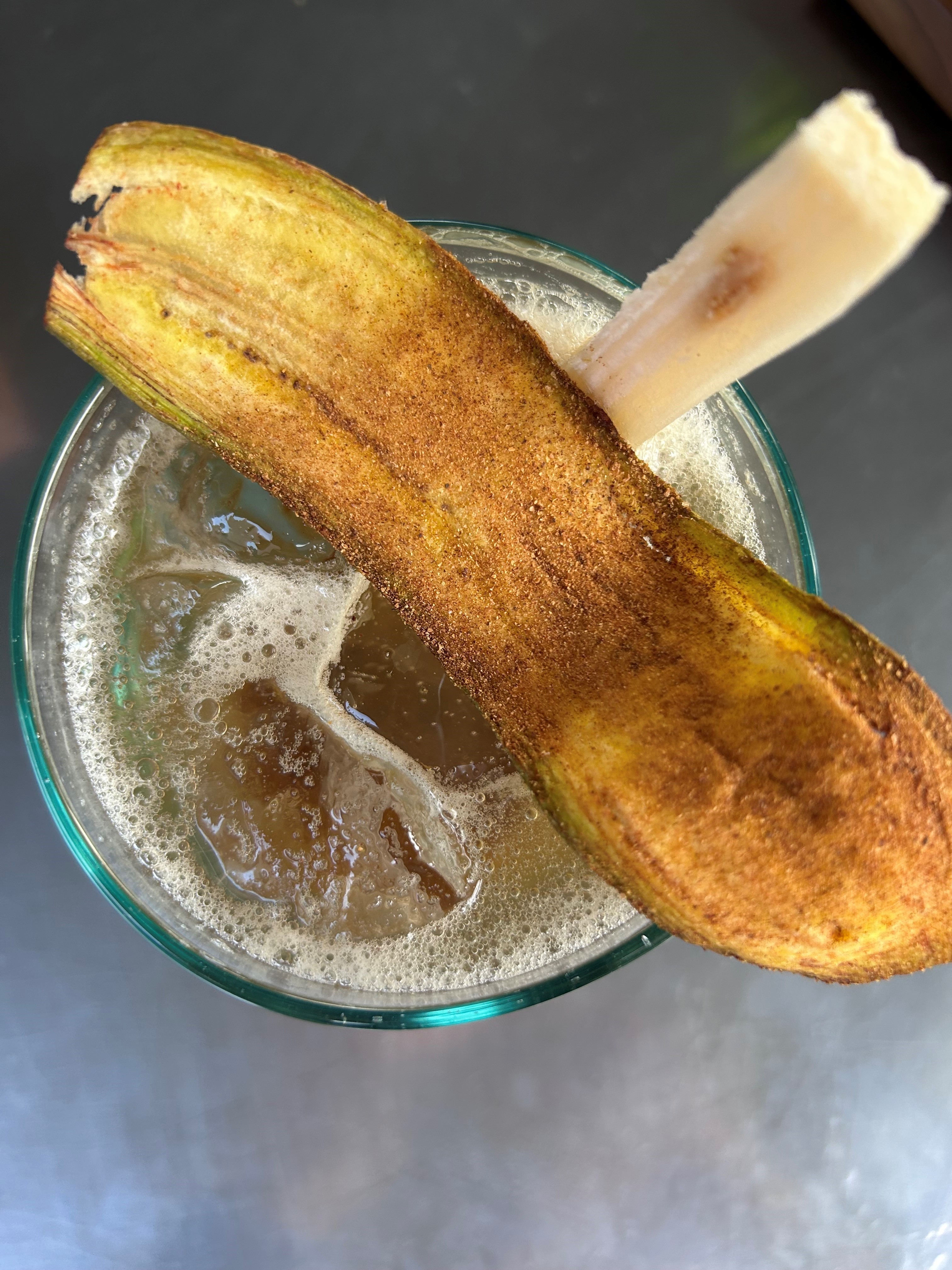 Banana coffee tonic: banana peel and coffee ground saccharum, homemade tonic water + add palapa nutmeg liqueur